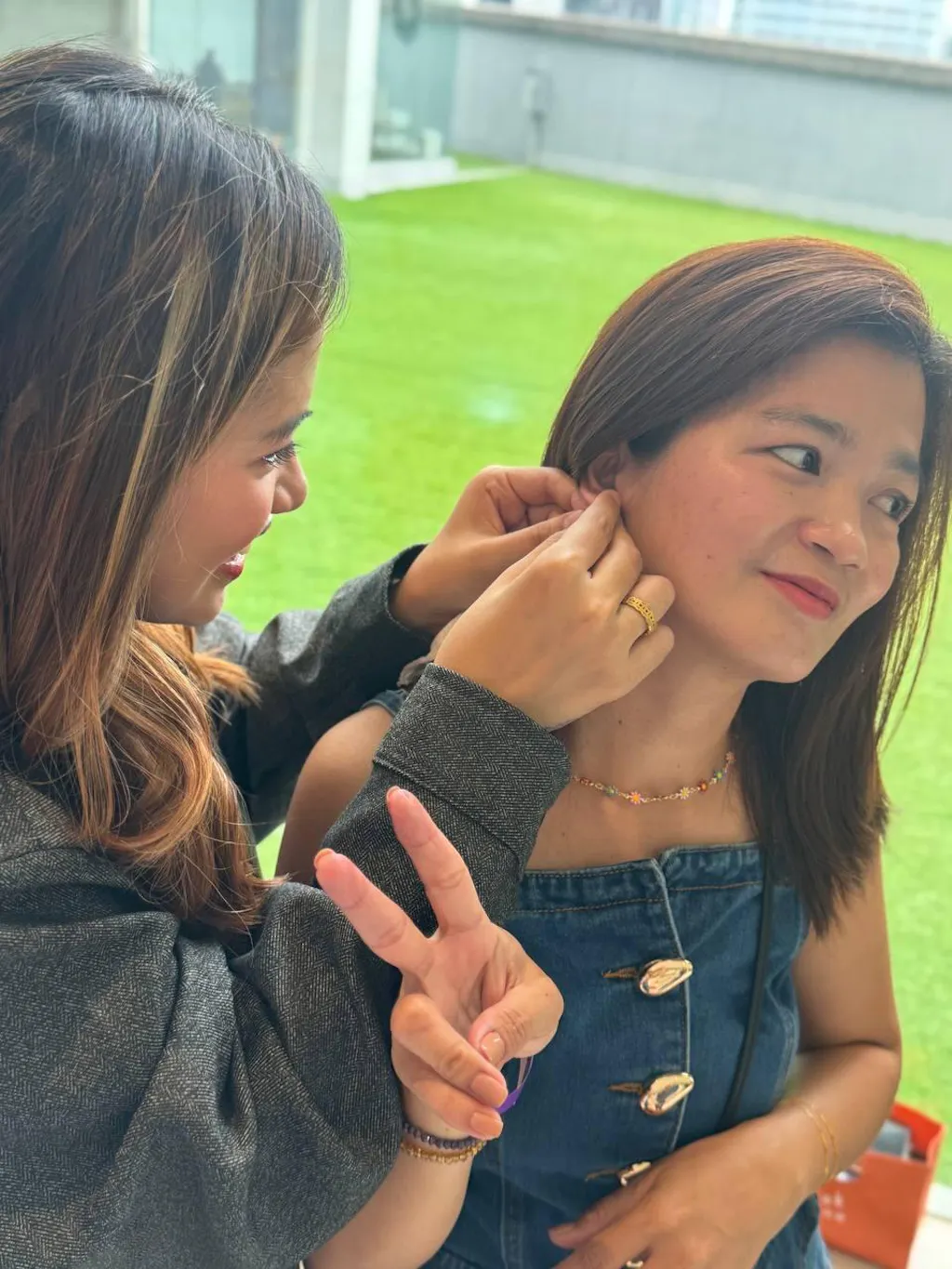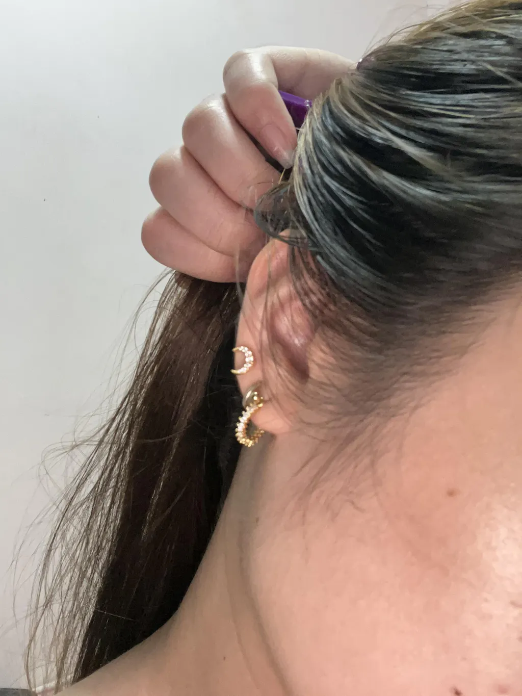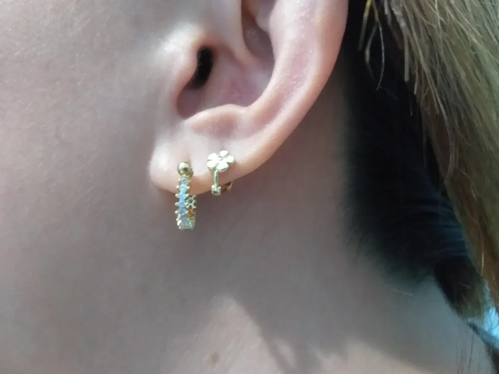 To wear, hold the earring post firmly with one hand and unscrew the 2 ball backs with your other hand. Screw back on to your desired tightness.