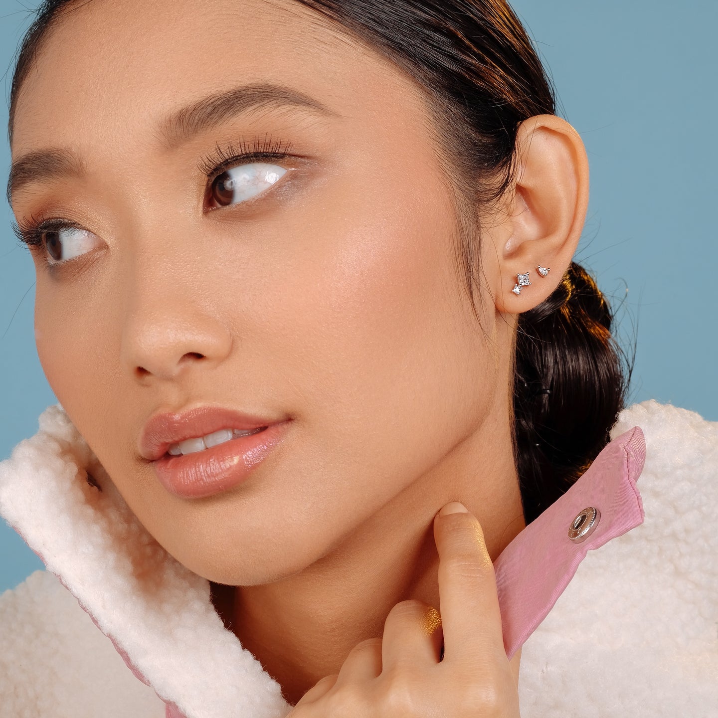 To wear, hold the earring post firmly with one hand and unscrew the ball back with your other hand. Screw back on to your desired tightness.