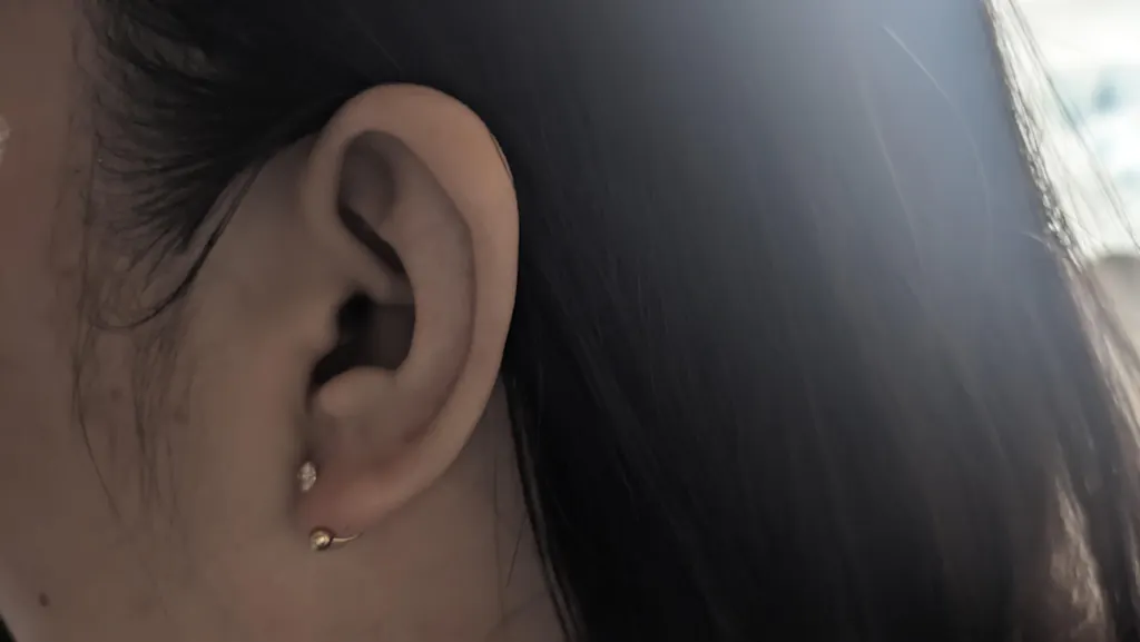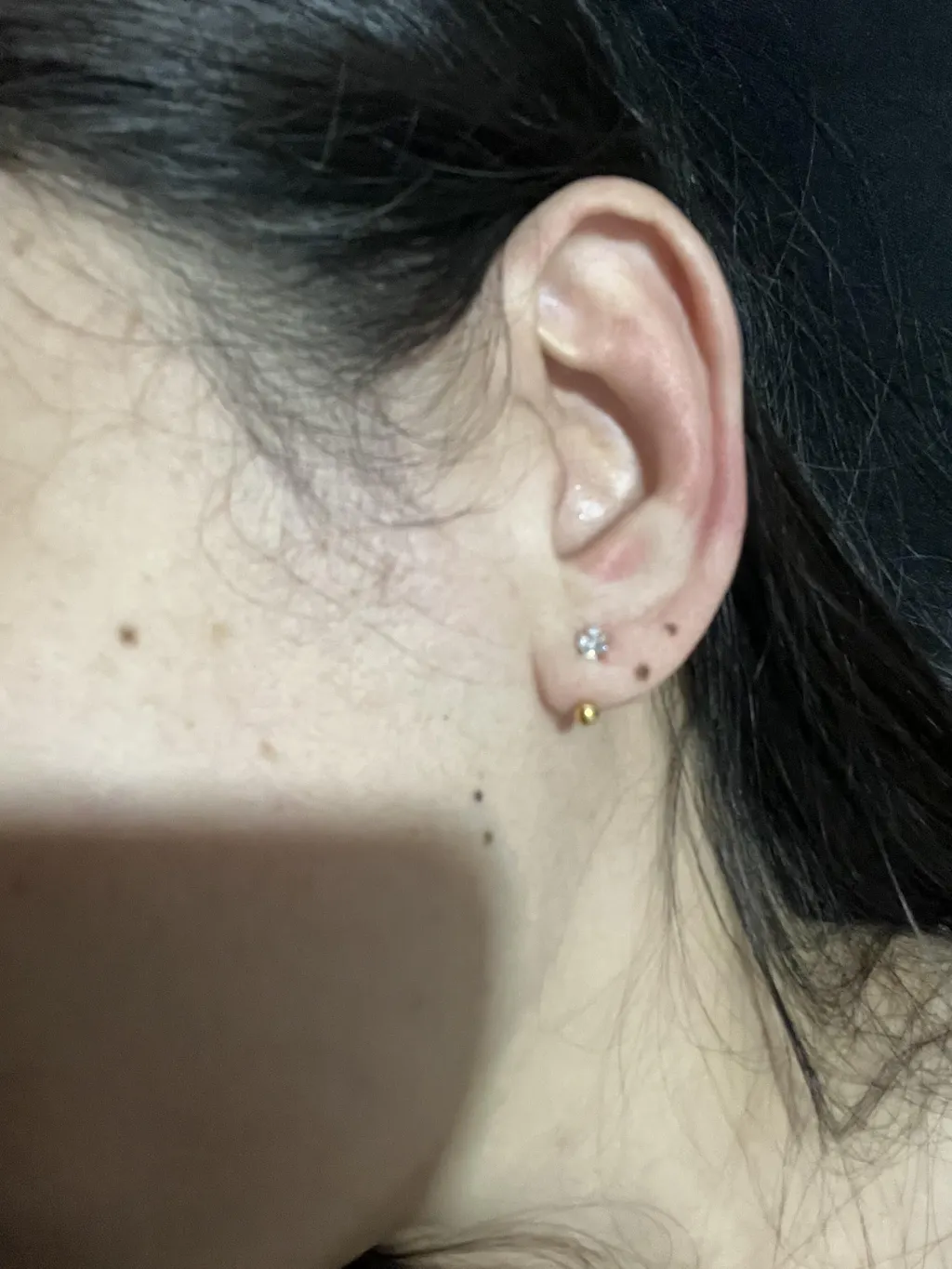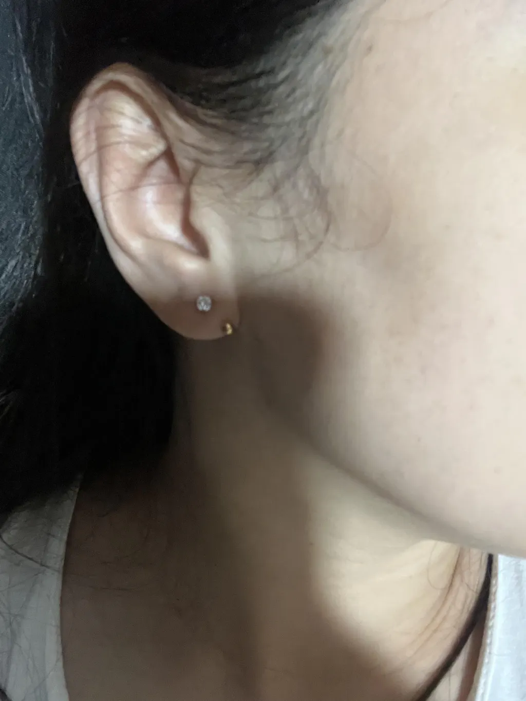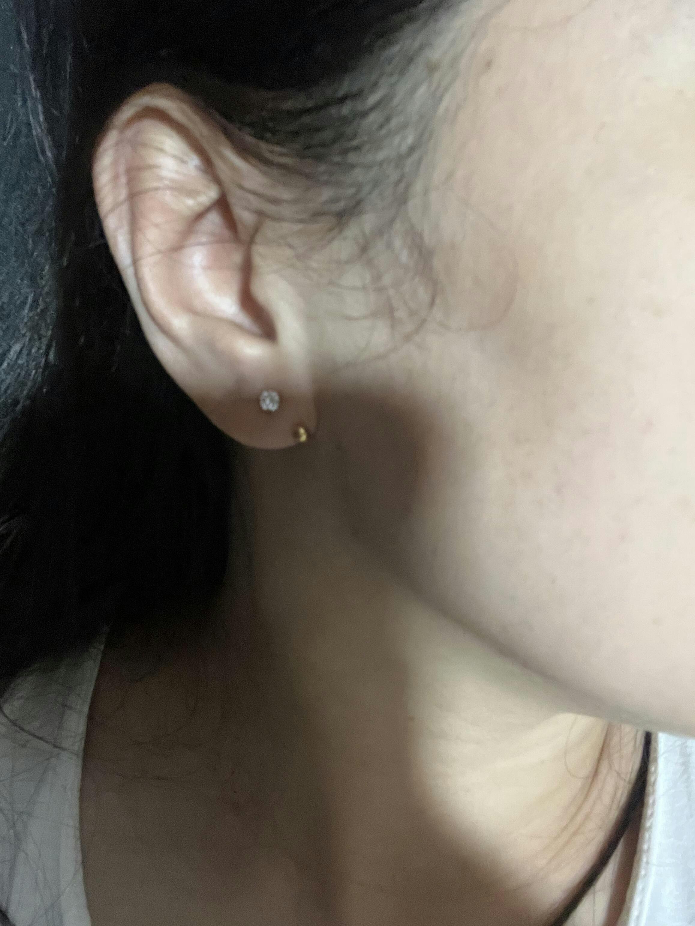 To wear, hold the earring post firmly with one hand and unscrew the ball back with your other hand. Screw back on to your desired tightness.