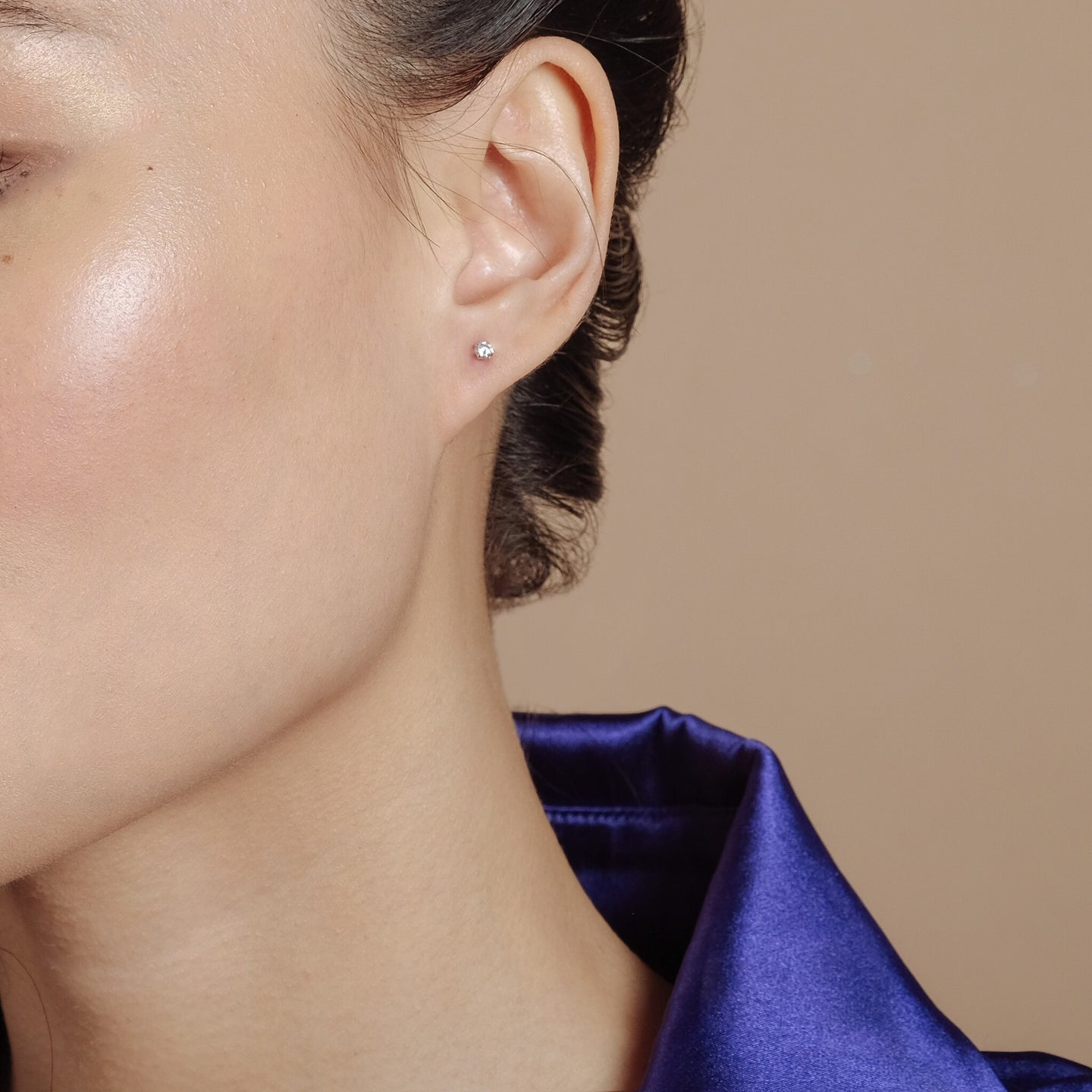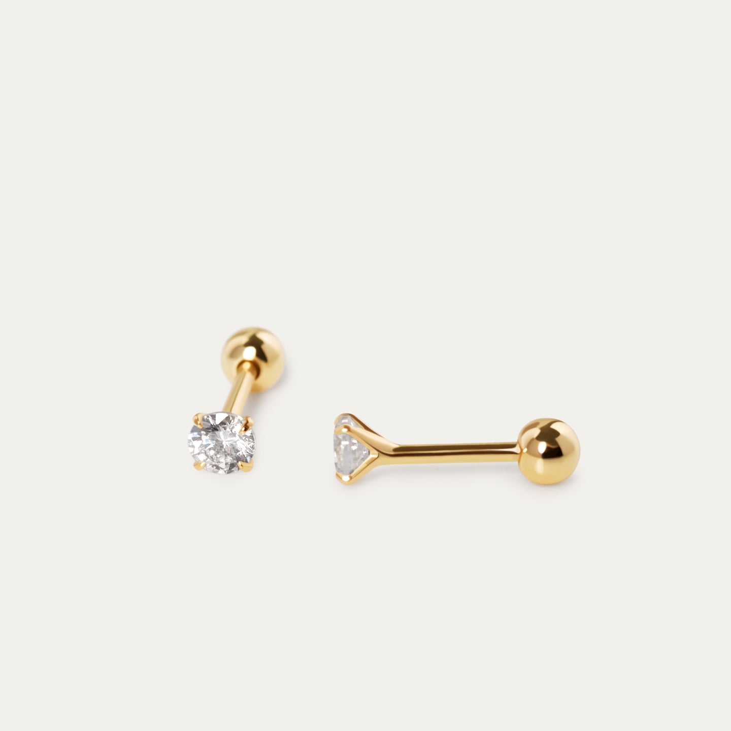 To wear, hold the earring post firmly with one hand and unscrew the ball back with your other hand. Screw back on to your desired tightness.